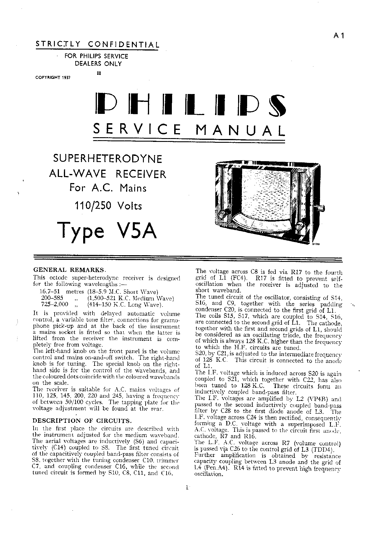 | DESCRIPTION | Cinema screen like set, lower slanted slide rule dial, upper central cloth grill, 2 lower front knobs, on left on/off/volume and on right tunning, left side band switch knob and right side band switch knob, there is no chassis, the set is built around the speaker, with parts fixed on all sides of the bakelite case. |